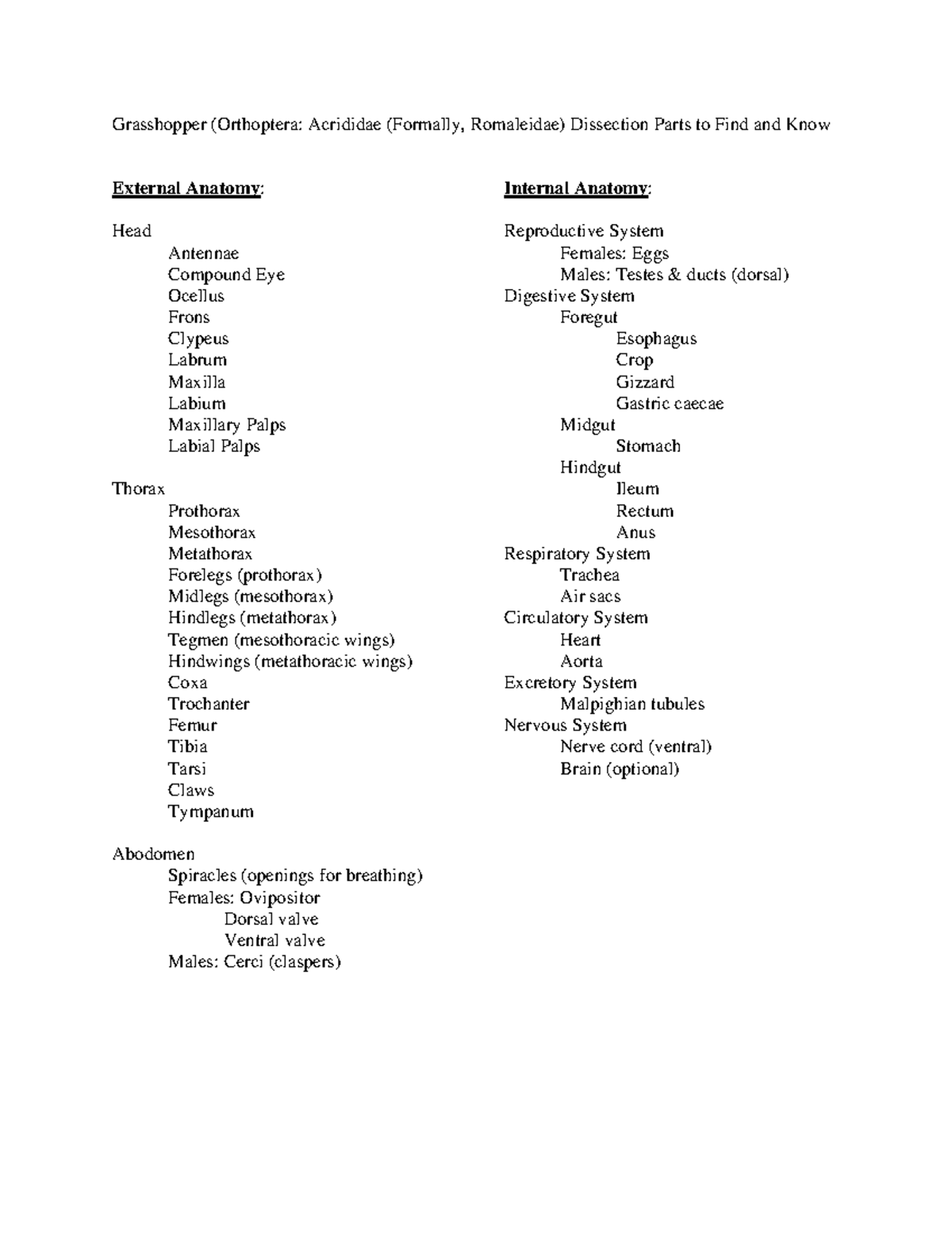 Grasshopper dissection answer key