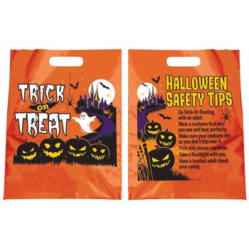 Custom Imprinted Halloween Trick or Treat Bags Custom Trick-Or-Treat Bags: 9" x 13" + 2" gusset. Minimum Qty Price: $0.55. Design your own Trick-or-Treat Bag or let us design something for you! These bags have fold-over reinforced die-cut handles and are printed on 2.5 mil poly. Custom Trick-Or-Treat Bags: 12" x 15" + 3". Minimum Qty Price: $0.63.