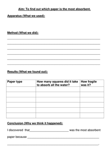 Absorption - Paper Towel Experiment | Teaching Resources Absorption - Paper Towel Experiment . Subject: Primary science. Age range: 7-11. Resource type: Other. 3.5 2 reviews. MrMiles23. 4.5600000000000005 29 reviews. ... A step by step investigation into absorption and how absorbent different materials are. Creative Commons "Sharealike" Reviews. 3.5 Something went wrong, please try again later ...