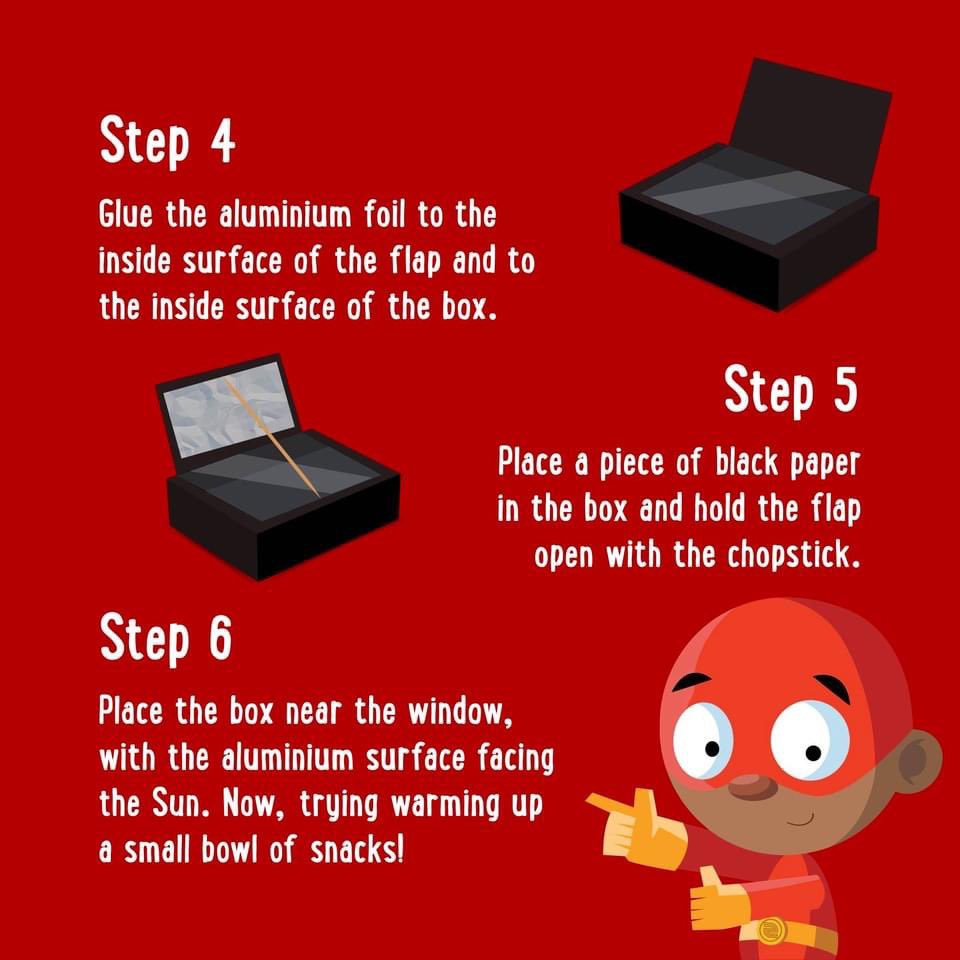 How To Make A Solar Oven - Little Bins for Little Hands HOW TO MAKE A SOLAR OVEN. STEP 1. Trace your ruler around the top edges of the box to leave a even square and carefully cut out the top. STEP 2. Wrap the cardboard square in foil and glue the edges to secure. STEP 3. Open the box and glue the black construction paper to the bottom of the box. STEP 4.