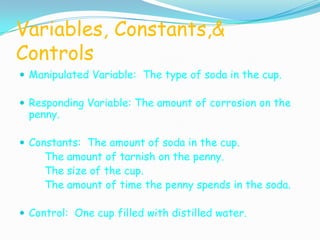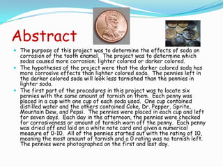 Lincoln penny science project - Finishing "Lincoln penny science project" 2003. I am right in the middle of my science project my experiment is leaving a penny in Coke, Diet Coke, Pepsi Twist and Cherry Coke. I've left the pennies there for three days and so far the only thing that has happened is that the diet coke has made a corrosion sort of ring around the penny.
