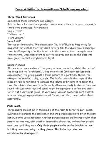 Drama Lesson Plans - ESL worksheet by Deenita Drama Lesson Plans worksheet. These are three separate Drama lesson plans that I wrote for an ESL summer camp. The games and activities can be adapted for beginner, intermediate or advanced students. Lesson 1 is an Intro. to Drama, Lesson 2 is Storytelling, Lesson 3 is an Intro. to Improvisation. Have fun! Drama Activity Lesson Plan: Working with Emotions ... Drama Lesson Plans for Kids: Pantomimes for Non-Readers; Drama Games and Acting for Kids: Pantomime Ball Toss; Drama Games and Activities: Who Wears This Hat? Use Drama in School: Write a Commerical Lesson Plan; Teaching Drama: Acting and Emotions; Two Drama Games For Elementary Students: Warm-Up Activities; Use the Machine Game to Warm Up Your ...