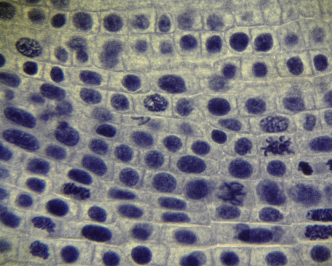 Onion Root Mitosis - Microscopy-UK Onion Root Mitosis Allium root tip. by Joseph C. Rossi . It is common to see photomicrographs of onion root cells when demonstrating how cell division takes place in plants. Onions have larger chromosomes than most plants and stain dark. The chromosomes are easily observed through a compound light microscope.
