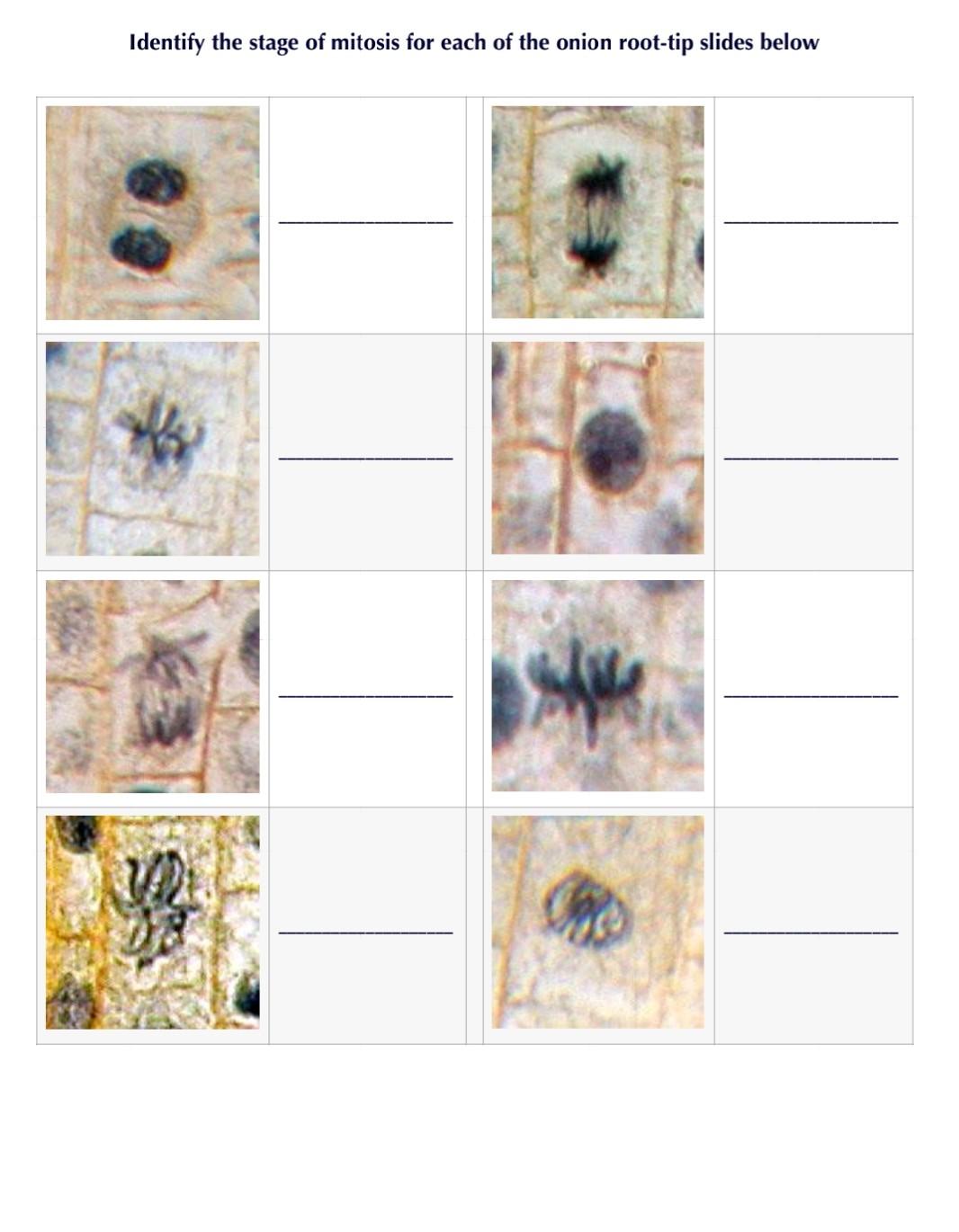 Onion root tip mitosis Lab hypothesis - obtain a prepared ... The onion root tips can be prepared and squashed in a way that allows them to be flattened on a microscopic slide, so that the chromosomes of individual cells can be observed easily This artificially high level of mitosis is then thought to damage root tissue, eventually slow overall root growth, and weaken the plant.