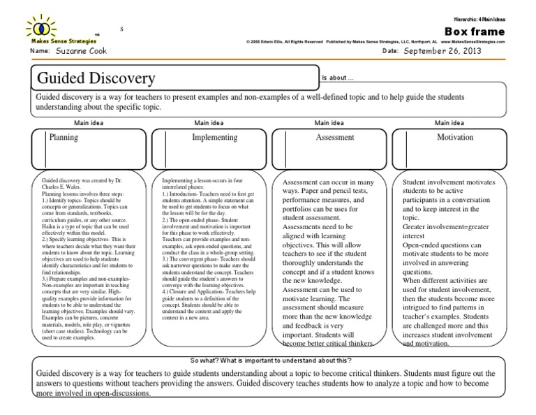 Guided discovery lesson plan. How to Use Guided Discovery Problems Keep the students engaged by keeping busy work, such as repetitive calculations, to a minimum. The heart of a guided-discovery problem is the leading questions that the students answer along the way. Here is where proper scaffolding is crucial. When well-written, these questions trigger the "Aha!" Inquiry-Based Learning: Definition, Examples ... - Study.com When using the guided discovery method of inquiry-based learning, the teacher begins with a quick mini-lesson, lasting no longer than 15 minutes. Following the lesson, the teacher will provide... discovery method of teaching Discovery method Discovery Learning is a technique of inquiry-based learning and is considered a constructivist-based approach to education. • It was introduced by burner. The Spectrum of Teaching Styles: The Convergent Discovery ... The Spectrum of Teaching Styles: The Convergent Discovery Style (g) Pre-impact set: a set of educational decisions that define the intent of the lesson. Includes planning, preparation, organizing, etc. Impact set: a set of actions made during the lesson and one-on-one feedback. The implementation of the pre-impact decisions in the actual lesson.