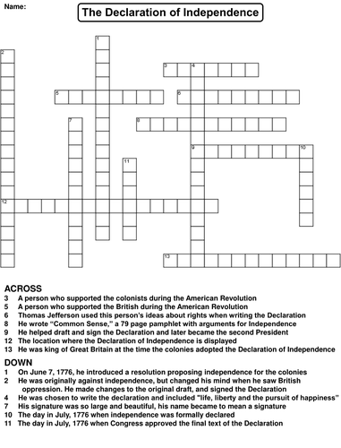 Declaration of independence crossword puzzle. The Herald-Leader Latest E-Edition. National Headlines. The Herald-Leader crosswordeg.com › natural-spongeNatural sponge Crossword Clue Answers, Crossword Solver Aug 18, 2022 · This crossword clue Natural sponge was discovered last seen in the August 18 2022 at the Puzzle Page Crossword. The crossword clue possible answer is available in 6 letters. This answers first letter of which starts with L and can be found at the end of H. We think LOOFAH is the possible answer on this clue. declaration of independence? Crossword Clue | Wordplays.com The Crossword Solver found 20 answers to "declaration of independence?", 5 letters crossword clue. The Crossword Solver finds answers to classic crosswords and cryptic crossword puzzles. Enter the length or pattern for better results. Click the answer to find similar crossword clues . 96 Declaration of Independence + Fourth July ideas in 2022 ... May 30, 2022 - Declaration of Independence and Fourth July printable word searches for kids, crossword puzzles, word scramble, some challenging word searches. FUN puzzles for kids to complete for Independence Day. See more ideas about declaration of independence, puzzles for kids, word search printables.