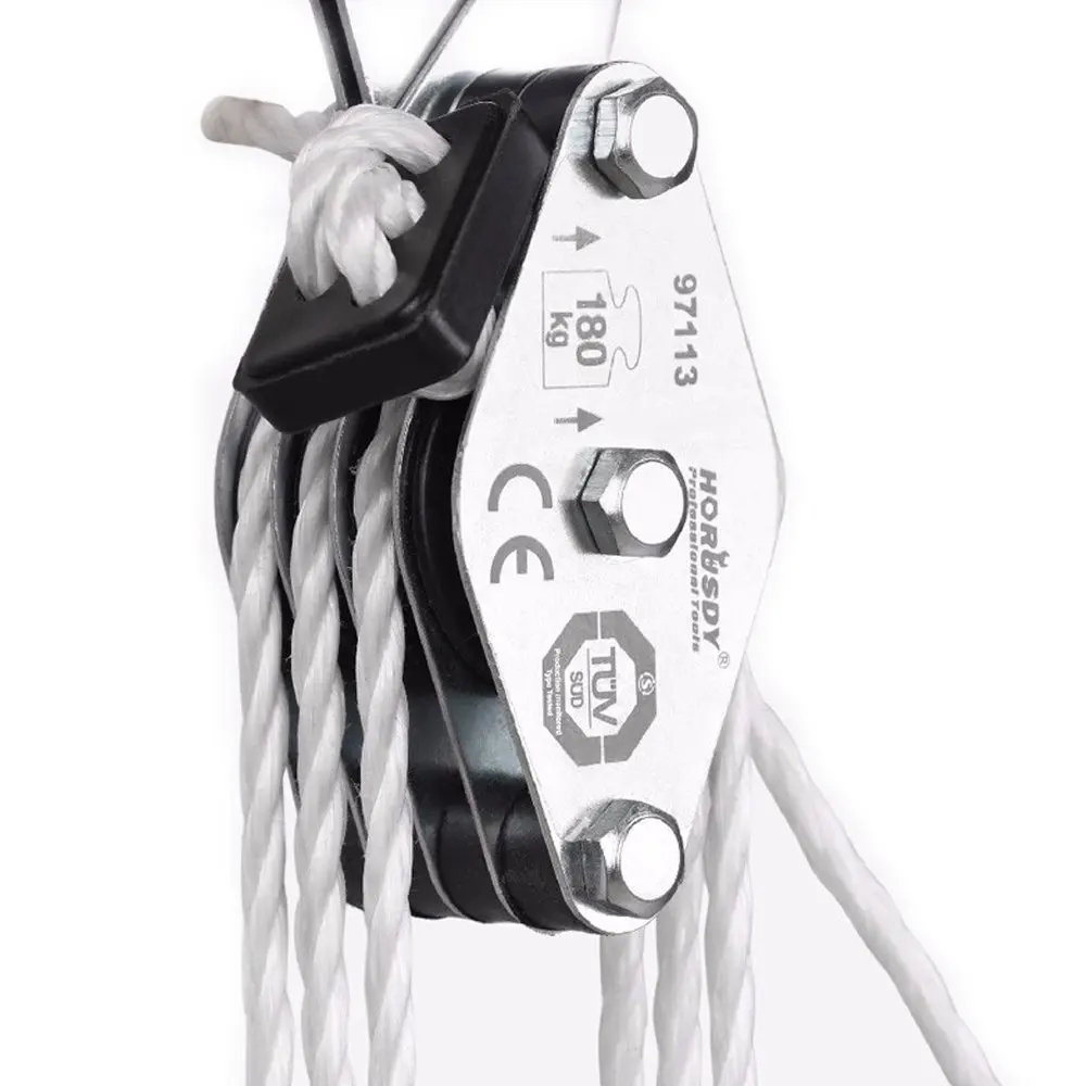 150 ft. L Twin Sheave Block and Tackle 7700 lbs. Capacity Stainless ... Made of high strength polyester, breaking strength of our 1/2 in. rope is 7700 lbs. 2 pulleys are made of aluminum material, which is durable and anti-rust. Perfect for indoor or outdoor use. An excellent double block and tackle pulley system. 7700 lbs. breaking strength: diameter of our rope is 1/2 in./12 mm.