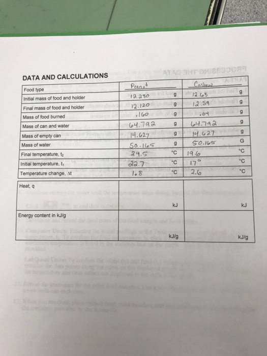 Energy Content of Food Lab Report Answers Put the thermometer in the water and find its temperature. Takedown all the readings. Repeat steps 1 to 12 for 3 times for each different type of chip. Find the average initial temperature, final temperature, and mass of the food sample. Use the formula, Energy = Volume of water x (initial-final temperature) x 4.2/ mass of food sample.