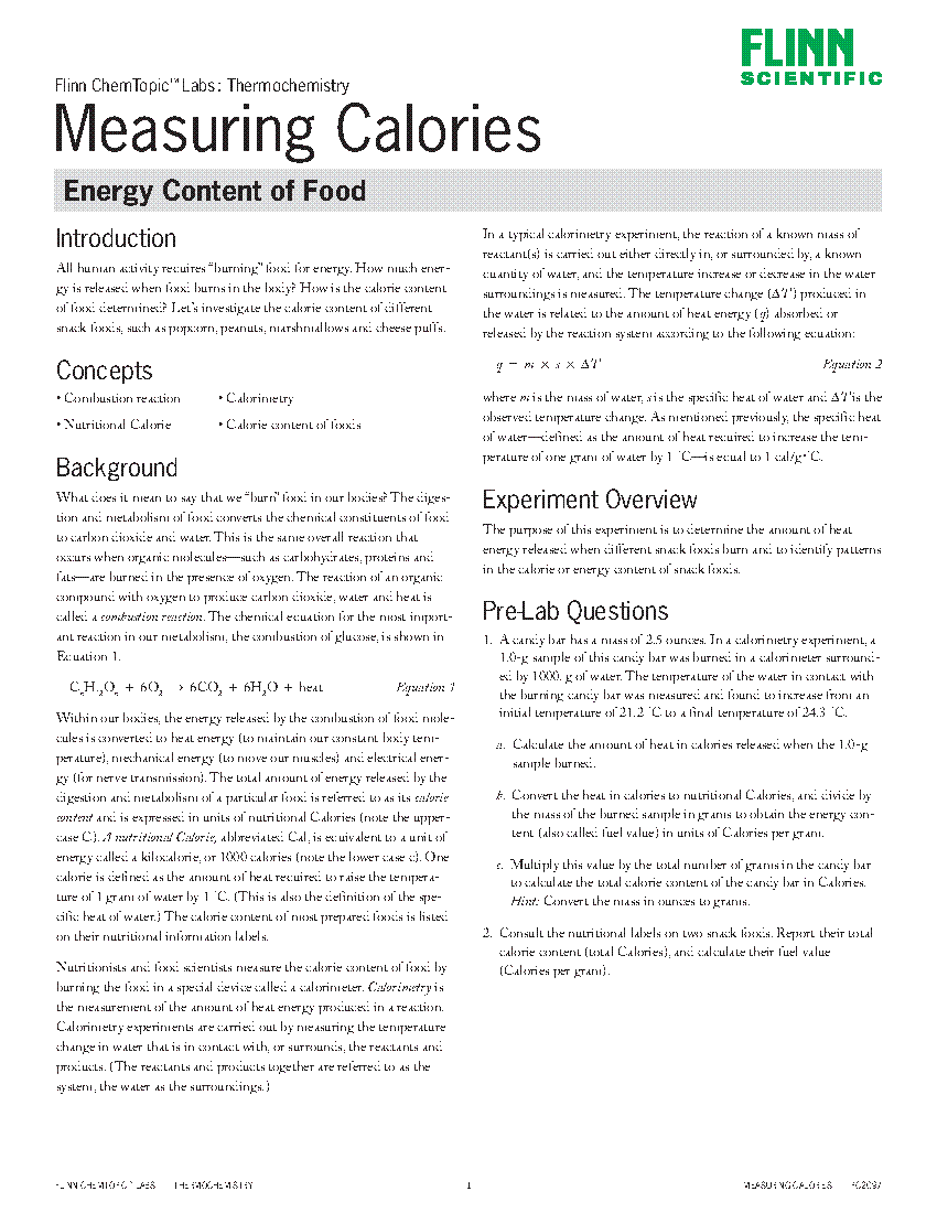 The Energy in Food You can determine energy content of food by burning a portion of it and capturing ... eating any popcorn; they have to last through the lab….and there's no ...5 pages