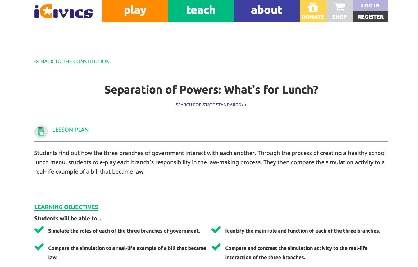 Branches of government lesson plans. Balancing Three Branches at Once: Our System of Checks and Balances Lesson Plan Balancing Three Branches at Once: Our System of Checks and Balances Photo caption One of the most persistent and overarching complaints the American colonists had about the rule of the British monarchy was the extent of its power. Lesson Plans | iCivics Available to print or complete online, our lesson plans make civic learning fun, relevant, and easy. iCivics provides traditional paper and digital lesson plans at the middle and high school levels. Developed to be easy to grade for you and easy to understand for your students. Our lesson plans are matched to state standards, and the unique ... Plan Of 3rd Branches Three Grade Government Lesson These are lesson plans for the 9th grade English class ( التاسعة اعدادي) Moved Permanently Students have three options for creating this trifold: 1 1 Analyze the preamble and articles of the North Carolina Constitution in terms of rights and 1, Activity instructions sheet 2 Calamity Rogue Guide 1, Activity instructions sheet 2. The third branch is judicial branch Grade 3 English ... PDF Thematic Unit on Elections: Lesson #1 Grade - eNetLearning they wrote under each branch of government. 11. Have spokes person from each group come up to the front of the classroom. 12. Guide the students in presenting each branch of government as well as their descriptions that include the role/functions of each branch. 13. Using the Teacher Resource Handout (located at the end of the lesson plan), add any