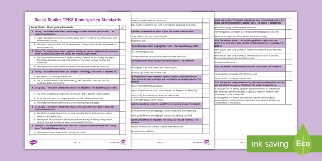 Essential Standards: Kindergarten Social Studies Unpacked Content - NC Kindergarten Social Studies Unpacked Content Current as of February 06, ... terminology frequently used and identified within the North Carolina Essential Standards for Social Studies. Key terms in bold, correspond to those that appear in the new standards, classroom instruction, and comprehensive assessments (formative, interim, and summative Social Studies | Oklahoma State Department of Education Oklahoma Academic Standards for the Social Studies, Pre-Kindergarten - 12 On February 28, 2019, the Oklahoma State Board of Education adopted the Oklahoma Academic Standards for the Social Studies, Pre-K - 12 as the new Social Studies curriculum standards framework for Oklahoma's schools. The framework sets forth a challenging and focused course of study and … Social Studies | Texas Education Agency The Curriculum Division social studies team provides direction and leadership to the social studies program, Kindergarten through grade 12. Assists districts statewide with implementation of the Texas Essential Knowledge and Skills (TEKS) for social studies. Collaborates with the Division of Student Assessment to develop state social studies ... PDF New Jersey Student Learning Standards - Social Studies Introduction Intent and Spirit of the Social Studies Standards All students receive social studies instruction from Kindergarten through grade 12. Today's challenges are complex, have global implications, and are connected to people, places, and events of the past. The study of social studies focuses on deep understanding of concepts that enable students ...