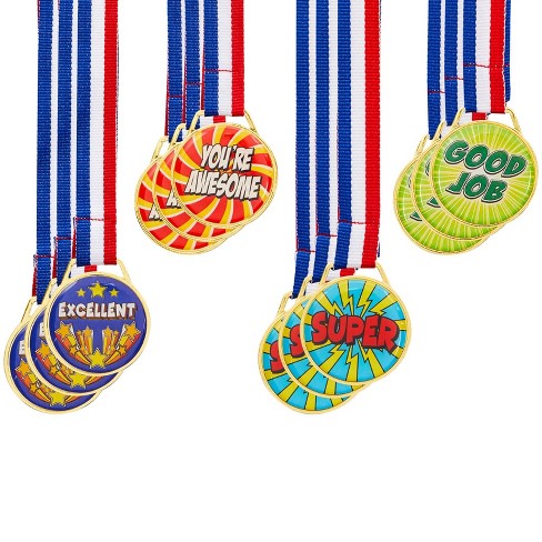 Juvale 12 Pack Gold Medals for Kids School Awards and Games, Competitions, Classroom Contests, 4 Designs