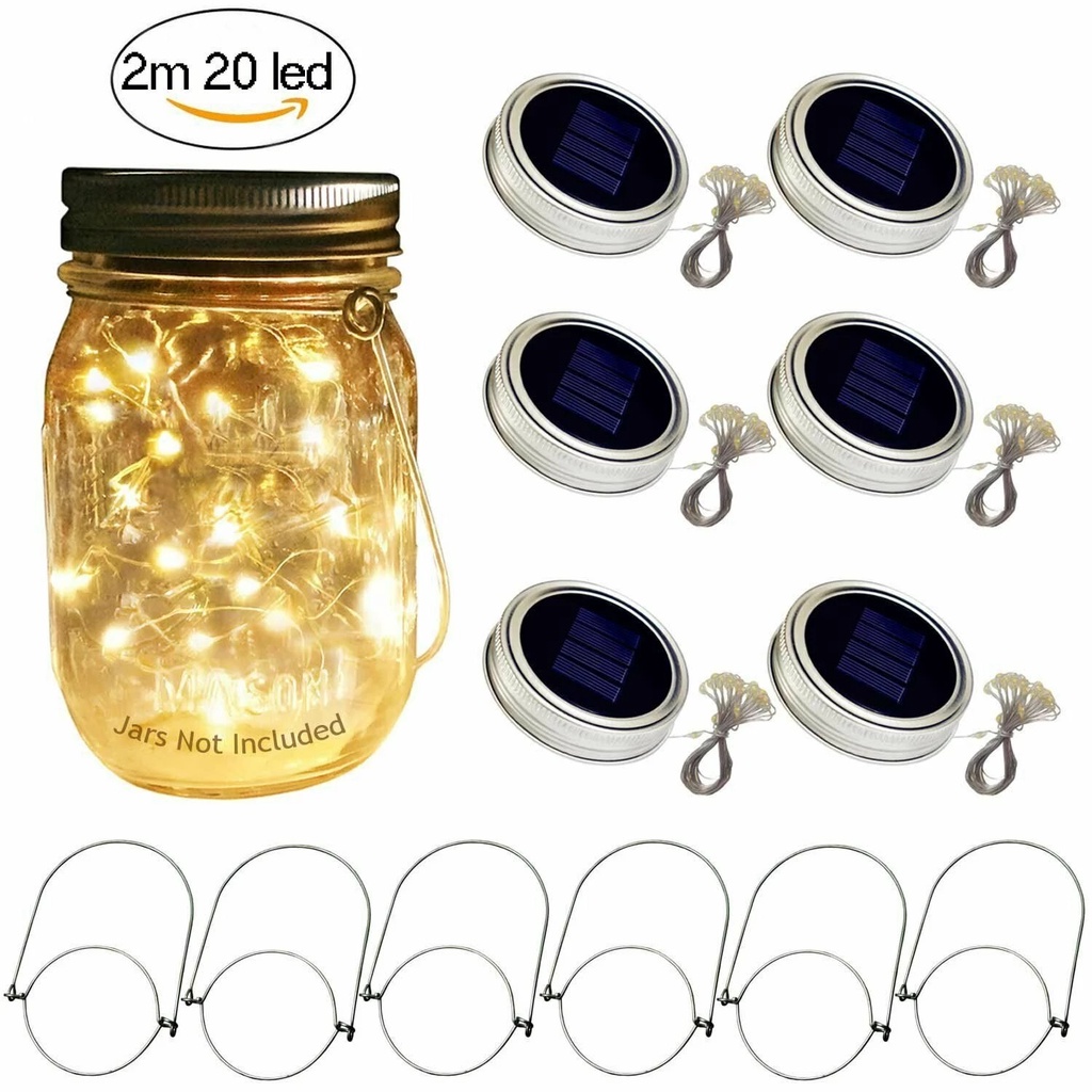 6 Pack Mason Jar Solar Lights with Hangers 20 LEDs Solar Powered Lid Lights, Indoor or Outdoor Usage (Jars Not Included)