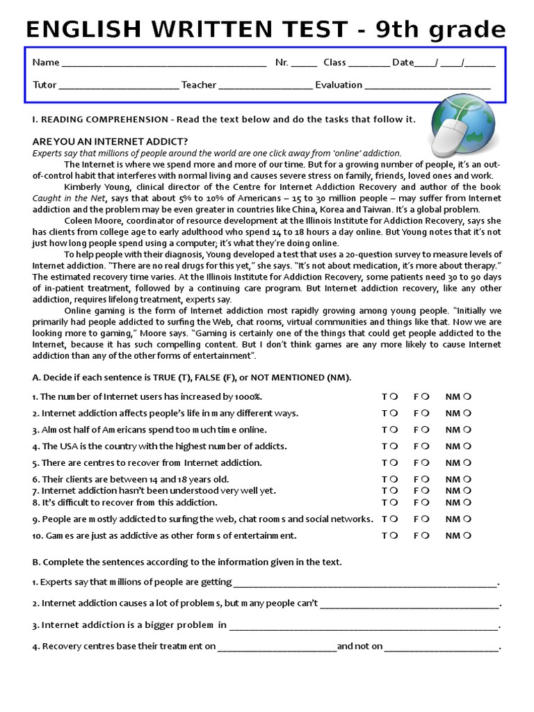 whichiscorrect.com › ninth-or-ninethNinth or nineth? - Spelling Which Is Correct How To Spell Definition of ninth: 1. ordinal number – 9th written as a word, It is the ninth case of the disease in this neighborhood. 2. noun – one of nine parts of something, A ninth of 27 will be 3. Collocations with ninth: Some common collocations include: come ninth, rank ninth, fall on the ninth of a month Year 9 English Comprehension Worksheets | Reading Comprehension - EdPlace Year 9 students will be encouraged to read widely, including fiction and non-fiction texts as well as different writing genres and styles. Our year 9 reading comprehension worksheets will help them begin to read with a critical eye, learning to analyse texts and create cohesive and sustained arguments based on their understanding. Short Advanced Reading Comprehension Test 9 With MCQs and Answers MISCELLANEOUS TESTS - Miscellaneous English Tests Online - Reading Comprehension, Dialogue Build, Colloquial and Idiomatic Expressions Questions with Answers. Cloze Tests - Cloze Tests category includes free online quizzes on cloze tests passages tests consisting of multiple choice questions with answers.