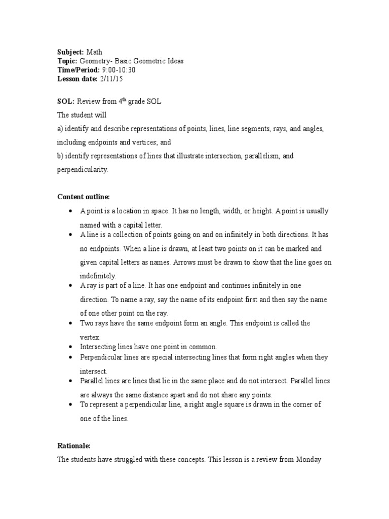 Shapes and Angles | 4th Grade Mathematics | Free Lesson Plan Label geometric objects in order to make it easier for them to be identified, located, and differentiated. · Understand that a point is a precise location in ... Grade Four Geometry Lesson Plan - Bright Hub Education 26 Jan 2017 — Hands-on activities can help fourth grades students comprehend the angles and attributes of common geometric shapes. The activities in this ...