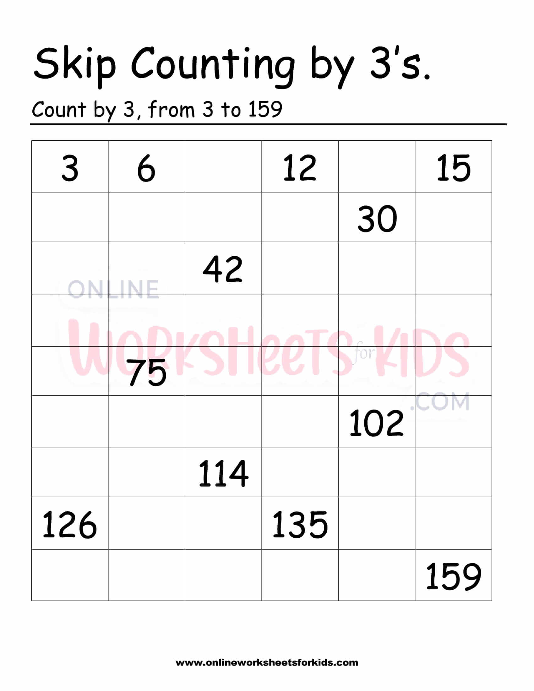 Free Skip Counting Multiplication Worksheets Download and print our FREE Skip Counting Multiplication worksheets. Ones - Skip Counting. FREE. Twos - Skip Counting. FREE. Threes - Skip Counting. FREE. Fours - Skip Counting. FREE. Skip Counting Worksheets / FREE Printable Worksheets - Worksheetfun Skip Counting Worksheets / FREE Printable Worksheets - Worksheetfun Home Kindergarten First Grade Pinterest Categories · Free Printable Worksheets Addition Addition - 1 Digit Addition - 1 More Addition - 10 more Addition - 2 Digit Addition - 3 Digit Addition - 4 Digit Addition - Add and Match Addition - Add and Multiply Addition - Add Tens eduworksheets.com › skip-counting10 Free Skip Counting Worksheets [PDF] - EduWorksheets Sep 4, 2022 · Skip Counting is a mathematical technique that’s considered a variation of multiplication. Older books call this technique counting by 2’s, 3’s, 4’s, and so on. For instance, in skip counting by 5 worksheets, students count to 50 by only identifying every 5th number – 5, 10, 15, 20, 25, 30, 35, 40, 45, 50. When you combine the base with the number of groups, you get the basic multiplication equation – 5 x 10 = 50. › free-skip-counting-worksheets-1-15sFREE Printable Skip Counting Worksheets (1-15s) - 123 Homeschool... Aug 10, 2021 · Whether you are a parent, teacher, or homeschooler, you will love these no pre, free printable skip counting worksheets for elementary age kids to practice counting. These skip counting worksheets are great for extra practice, summer learning, math center in classrooms, and any other enrichment activity. Personally, we use these with our Classical Conversations Foundations for a free printable worksheet to enhance our learning and make it stick so my kids have a solid grasp so they are ready ...