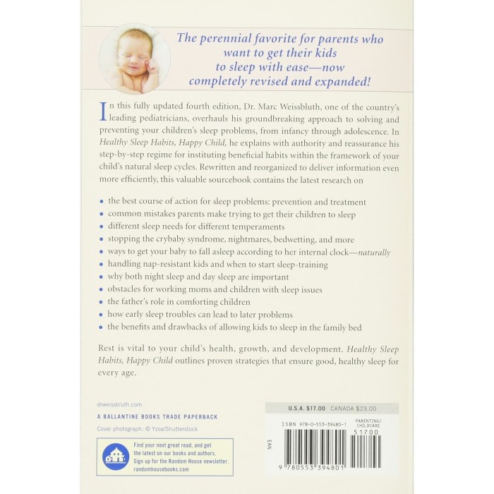 Healthy Sleep Habits, Happy Child: A Step-by-Step Program ... Every night and at every nap, sleep recharges the brain's battery. Sleeping well increases brainpower just as lifting weights builds stronger muscles, because ... Healthy Sleep Habits, Happy Child: Prevent and Treat Sleep ... Dr. Weissbluth explained there are three components of facilitating self-soothing; putting your baby down when they are drowsy but awake, getting other people ...