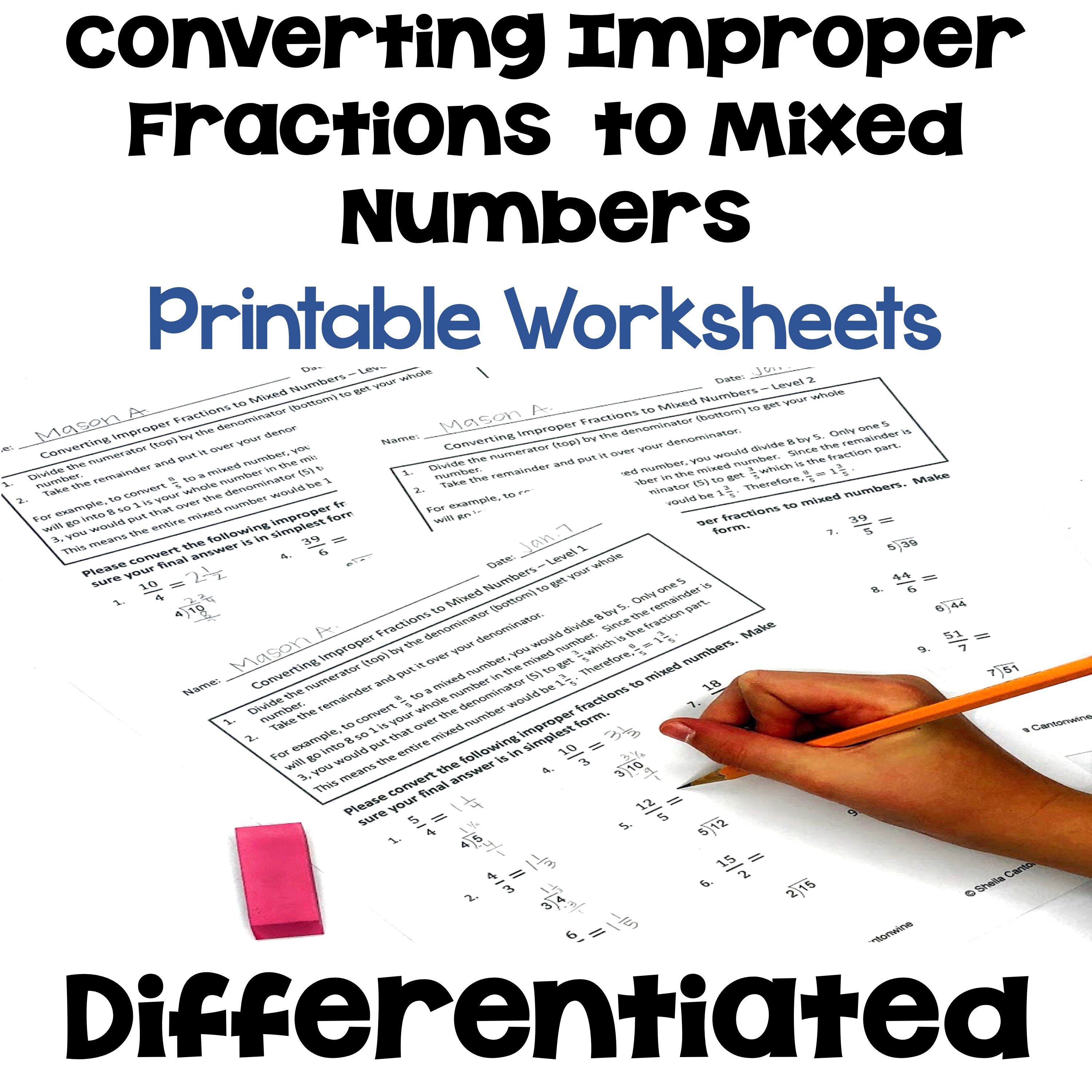 Convert improper fractions to mixed numbers - K5 Learning Convert improper fractions to mixed numbers Worksheets: Write improper fractions as mixed numbers Below are six versions of our grade 4 fractions worksheet on re-writing improper fractions (fractions > 1) to mixed numbers. These worksheets are pdf files. Worksheet #1 Worksheet #2 Worksheet #3 Worksheet #4 Worksheet #5 Worksheet #6 5 More Similar: